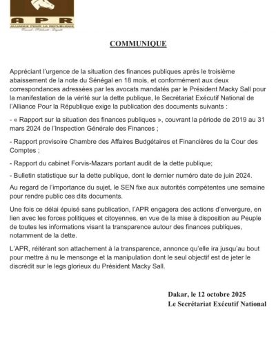 Le Secrétariat Exécutif National de l’alliance Pour la République convie la presse nationale et internationale à un point de presse prévu à 17h 30 au siège du Parti.