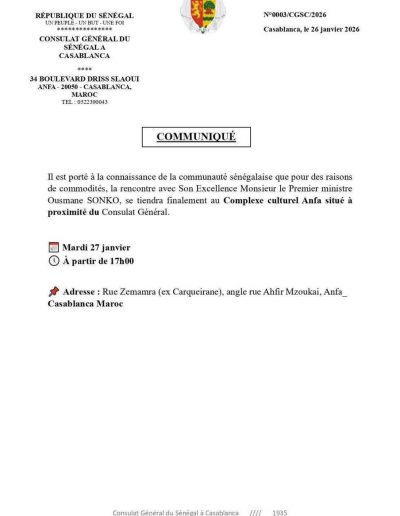 Dakar, le 26 janvier 2026 Le CCUAP déplore les nombreux accidents de circulation et appelle l’État à des mesures urgentes pour protéger la vie des usagers. Le Collectif Citoyen des Usagers des Aménagements Publics et Privés (CCUAP) exprime sa profonde consternation et...