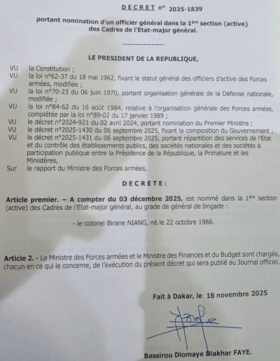Le président Bassirou Diomaye Faye a informé, dans une lettre datée du 11 novembre 2025, de la fin de la mission de Madame Aïda Mbodj à la tête de la Coalition Diomaye Président, qu’il a remerciée pour son engagement lors de la victoire du 24 mars 2024. Le chef de...