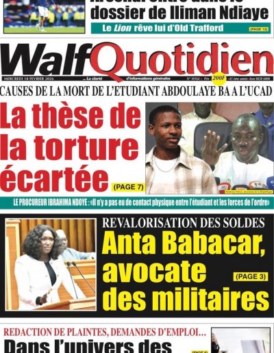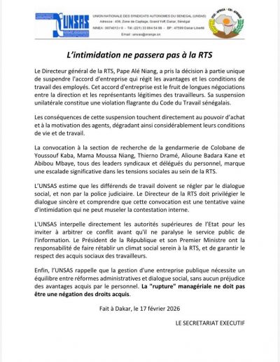 La Gendarmerie nationale a reçu, le lundi 16 février 2026, les élèves de l’établissement scolaire Hyacinthe Thiandoum au quartier Samba Diery Diallo à Colobane. Cette initiative s’inscrit dans une démarche éducative visant, d’une part, à faire découvrir aux élèves les...