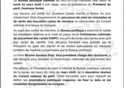 Le Bureau politique national de PASTEF–Les Patriotes s’est réuni ce lundi 02 mars 2026 à son siège, sous la présidence du Président du parti, Ousmane Sonko.