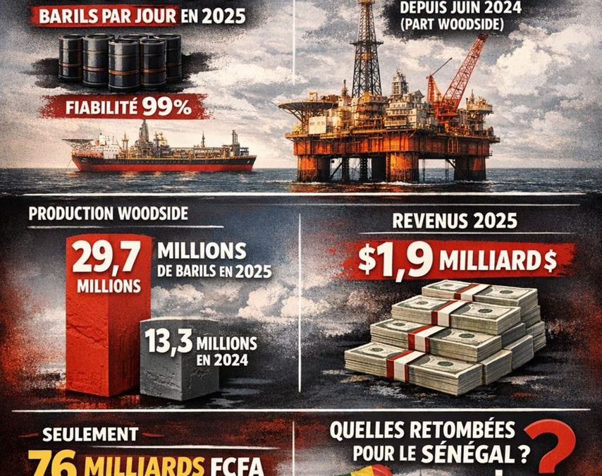 Sur l’exercice 2025, la part de production revenant à Woodside s’est élevée à 29,7 millions de barils équivalent pétrole, contre 13,3 millions en 2024, année partielle de démarrage. Cette première année complète de production et de commercialisation aurait généré 1,9 milliard de dollars de revenus pour la compagnie australienne. Aucune donnée détaillée n’a toutefois été communiquée sur la part exacte revenant à Petrosen ou à l’État sénégalais.