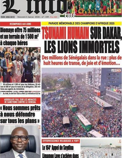 Levée de corps demain jeudi à 10h à la grande mosquée de mermoz ( imam Diabel Ndiaye) enterrement aux cimetières de Yoff.Condoléances chez lui fenêtre mermoz n’ 69.